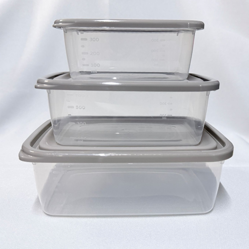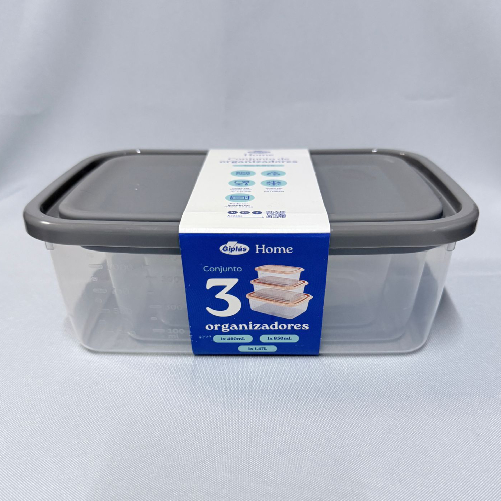 Práctico set de 3 organizadores plásticos de formato rectangular, indispensables para almacenar y conservar alimentos. El kit incluye tres potes de distintas capacidades escalonadas (460ml, 850ml y 1.47 litros) diseñados para guardarse uno dentro del otro, optimizando el espacio en tus muebles. Cuentan con medidor lateral visible y tapas de cierre seguro en un elegante tono gris. Venta por bulto cerrado de 12 kits.