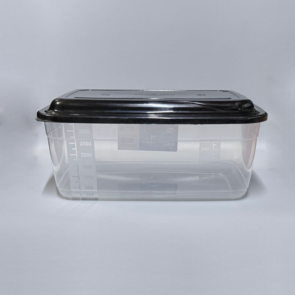 Recipiente plástico de gran capacidad (3.6 litros) con formato rectangular, ideal para el almacenamiento de grandes volúmenes. Cuenta con una resistente tapa negra de cierre seguro y un medidor en relieve en el lateral para calcular el contenido rápidamente. Su diseño reforzado y apilable lo hace perfecto para optimizar el espacio en alacenas, cocinas comerciales o depósitos. Venta por bulto cerrado de 24 unidades.